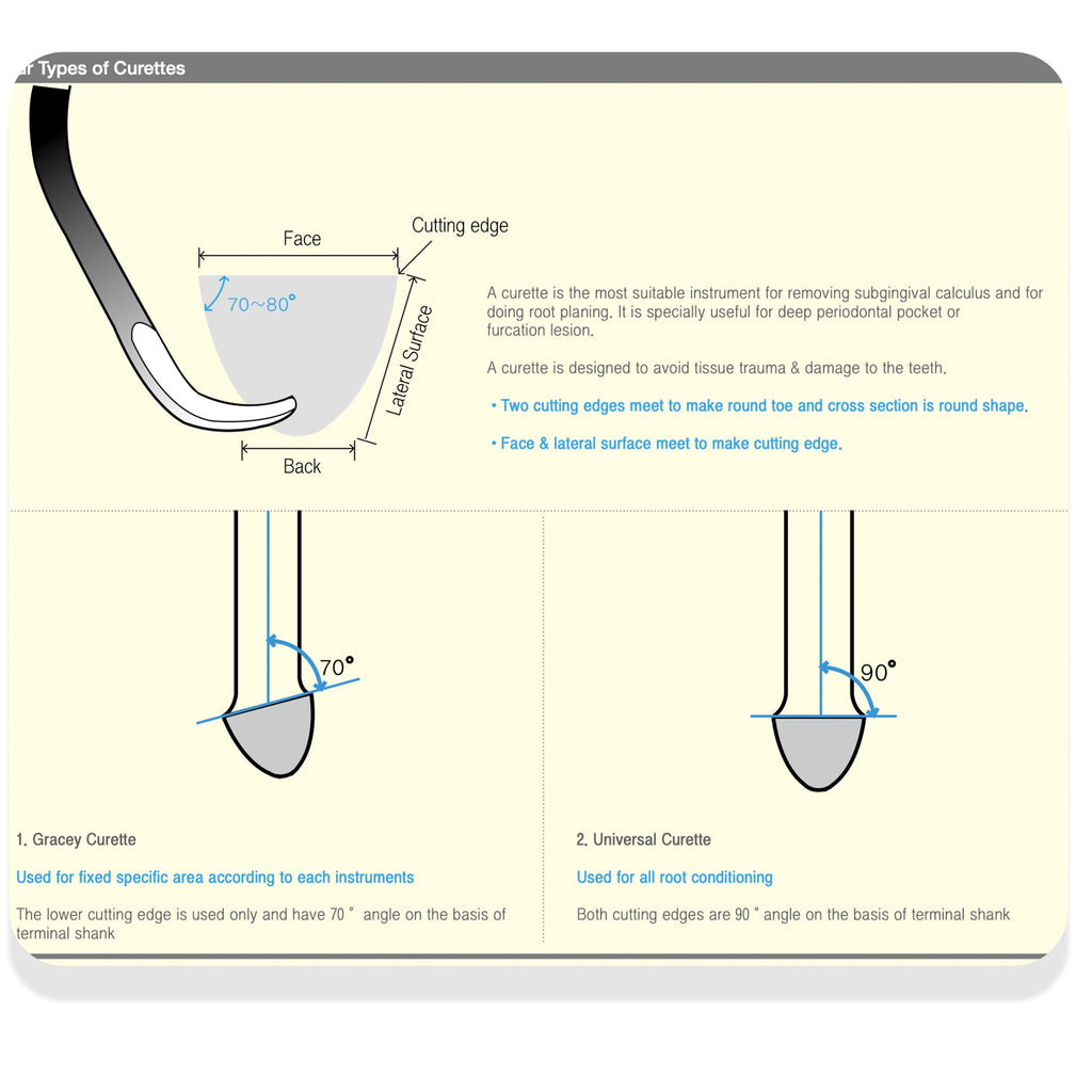 - Gracey Curette: Used for fixed specific area according to each instruments. The lower cutting edge is used only and have 70 ̊ angle on the basis of terminal shank