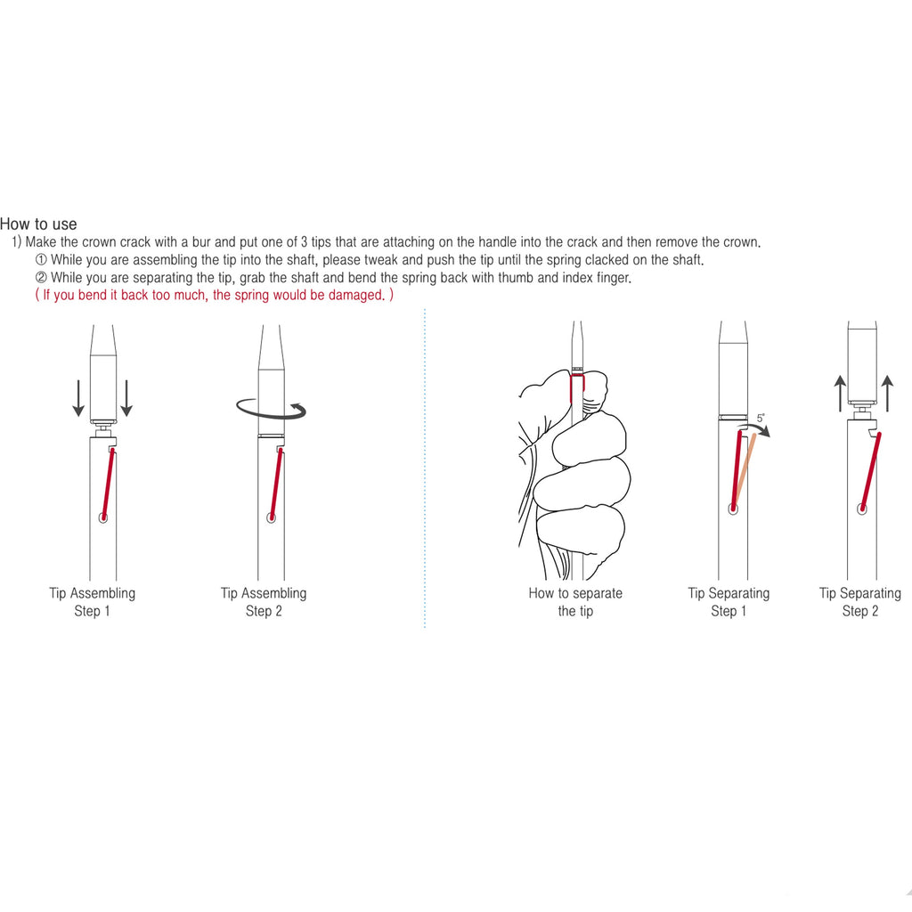 - Make the crown crack with a bur and put one of 3 tips that are attaching on the handle into the crack and then remove the crown.