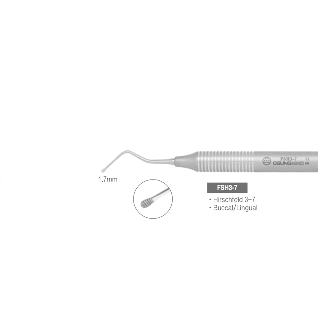 Dental File Scaler, Hirschfield, FSH3-7Dental File, Hirschfield , FH 3-7. This Periodontal file is effective in crushing large calculus deposits so that the deposits can be more readily removed by a curette. Also, can be used to smooth the margins of amalgam restorations. These files feature a lightweight stainless handle to reduce stress on hands while providing superior tensile strength. The grip is ergonomically designed to limit stress on hands while providing maximum tactile sensitivity.