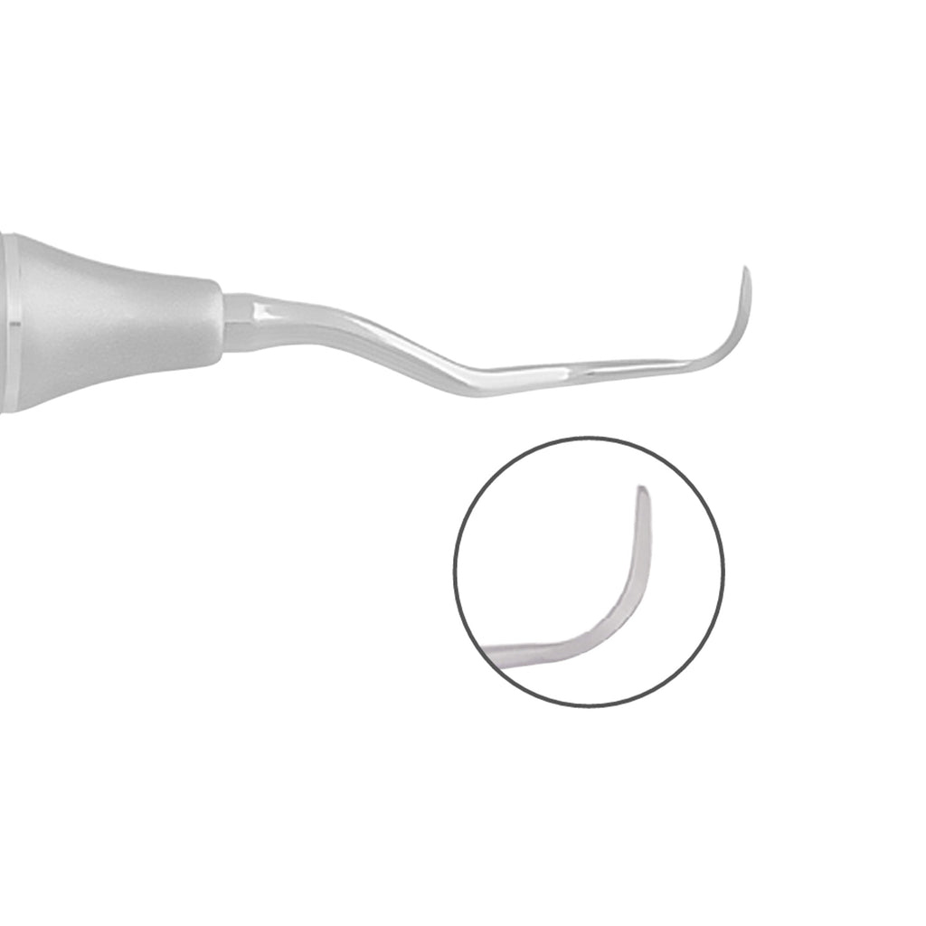 Gracey Curettes have a blade that is laterally offset by 70 degrees relative to the shank and has a lower cutting edge and an upper non-cutting edge. Only one side of the blade can be used. The tip on the Rigid Gracey Curette is strong and thick compared to Standard gracey curette so it can remove more calculus without extra use of sickle scaler or hoe scaler.