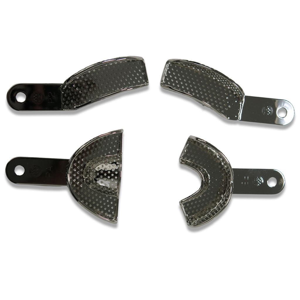 Dental Impression Tray Set, 4 pcs, Partial, TBWPZ4Impression Trays Set, 4 pcs, Partial, Ni-Brass, D-TBWP-1. Set of 4 Ni-Brass PARTIAL SIZE Impression Tray Set (PA,PB,P1,P2). These are the most popular patterns of the market. Made from qualify nickel-plated brass. It provides ideal dentulous impression. Product Code: D-TBWP-1