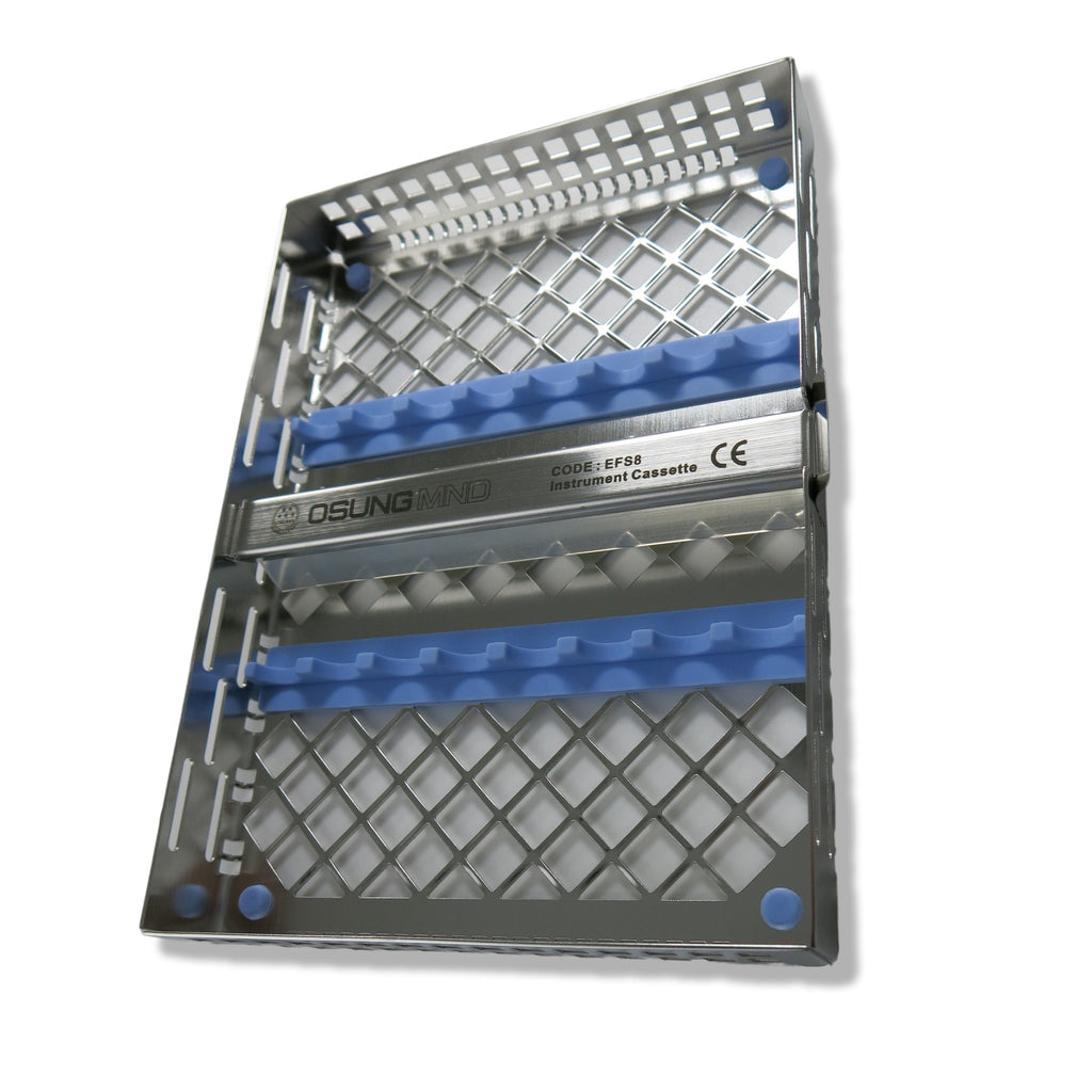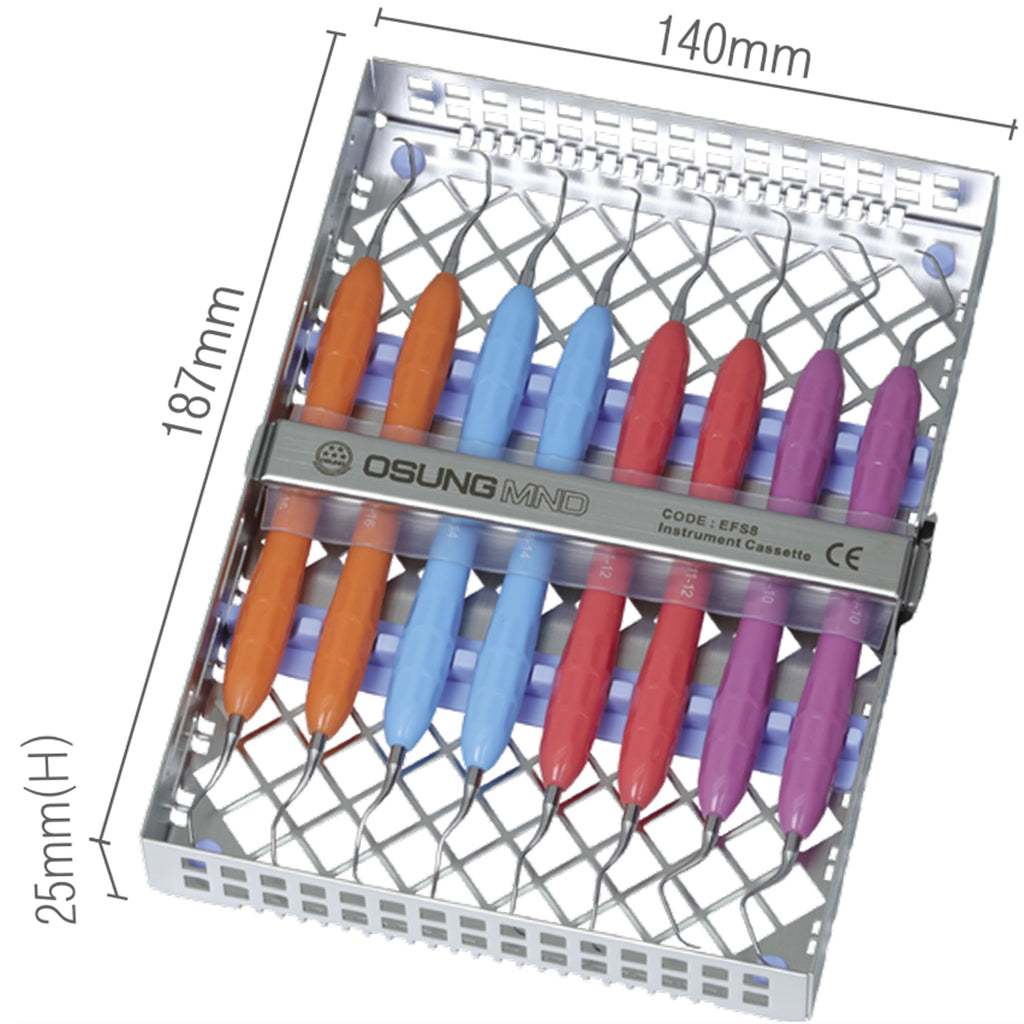 Dental Instrument Cassette, EFS8Dental Instrument Cassette, EFESS-8. Double sides. Made of stainless steel and polished surface for rust free performance. Exterior dimensions: 188mm x 135mm x 25mm. Have 8 instruments capacity (max length 184mm). Items in picture can be ordered separately and not included with the cassette.
