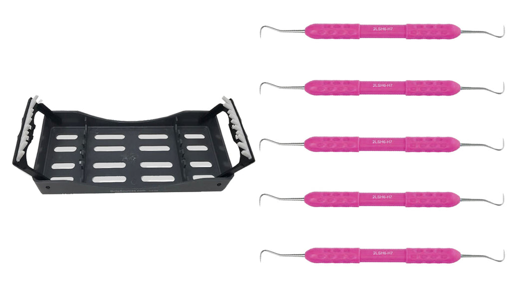 Set of 5 Sickle scalers. These scalers have sharp edges on both sides to remove calculus in anterior and pre-molar. Pointed tip end. Comes with storage and sterilization cassette. Excellent quality. Silicone Handle for comfortable holding in hand to prevent fatigue. Autoclavable.