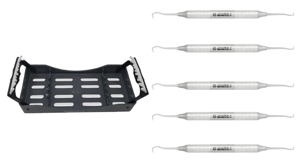Set of 5 Sickle scalers. These scalers have sharp edges on both sides to remove calculus in anterior. Pointed tip end. Comes with storage and sterilization cassette. Excellent quality. Light Wt Metal Handle for comfortable holding in hand to prevent fatigue. Autoclavable.