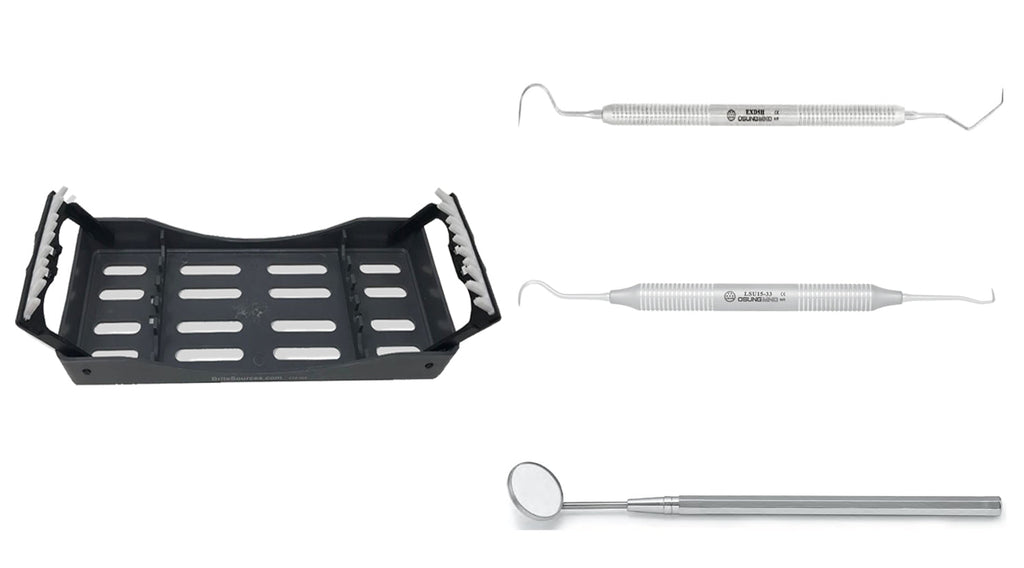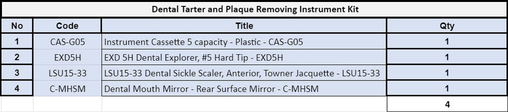 Dental Tartar Scraper and Remover Kit. This set includes: Dental Pick, Scaling instrument, Dental Mouth Mirror with plastic storage cassette. These Stainless Steel Handle dental tools helps remove tartar and plaque from teeth. Knurled handles provides excellent hand control. These are Professional quality dental instruments: Scaler SU 15-33, Explorer 5H and Simple Stem Mirror. The cassette is light weight and made of Plastic. All instruments are sterilisable and autoclavable. Avoid harsh use.