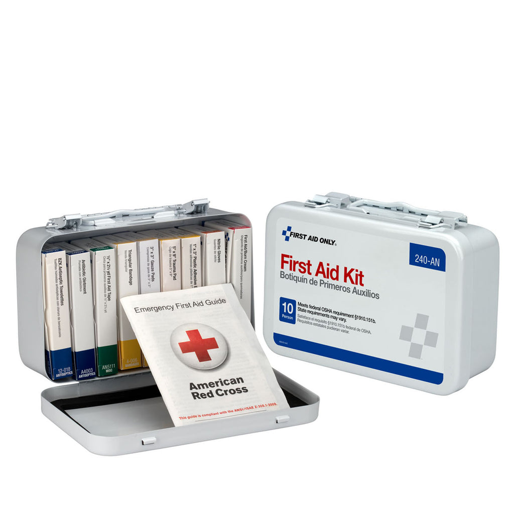 Designed For The Workplace, These Kits Are Compliant With Ansi Regulations And Also Meet Or Exceed Federal Osha Requirements (States May Vary). Kit Includes: (1) An146: 1"X3" Adhesive Plastic Bandages, 16/Bx; (1) An206: 3"X3" Gauze Dressing Pads, 8/Bx; (1) An205: 5"X9" Trauma Pad, 1/Bx; (1) An5071: 40" Triangular Sling/Bandage, With 2 Safety Pins, 1/Bx; (1) An337: Bzk Antiseptic Towelettes, 10/Bx; (1) An4040: First Aid/Burn Cream Packs, 10/Bx; (1) An5111: 1/2"X2.5 Yd. First Aid Tape Roll, 2/Bx; (1) A4003: Antibiotic Ointment Packs, 10/Bx; (1) An5112: Exam Quality Vinyl Gloves, 4/Bx; (1) First Aid Guide