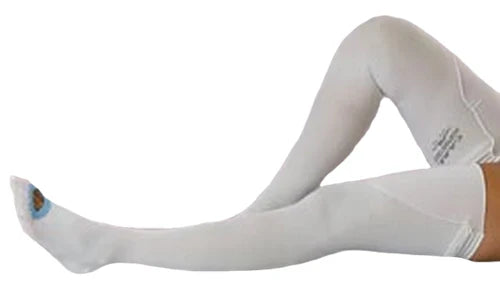 Rightway System assists proper alignment. Anti-microbial finish. Alignment indicator aids proper positioning. Seams face outward to reduce skin irritation. 33 sizes available. Textured foot for durability. Sewn-in comfort panel in waist and thigh length. Inspection port conveniently located on top of foot. Quick drying and stain resistant. Color coded size identification. Two-way stretch fabric eases application. Three lengths available: Knee, Thigh, and Waist. No blind, roll-resistant premium elastic top. Waist length has an adjustable waist strap.