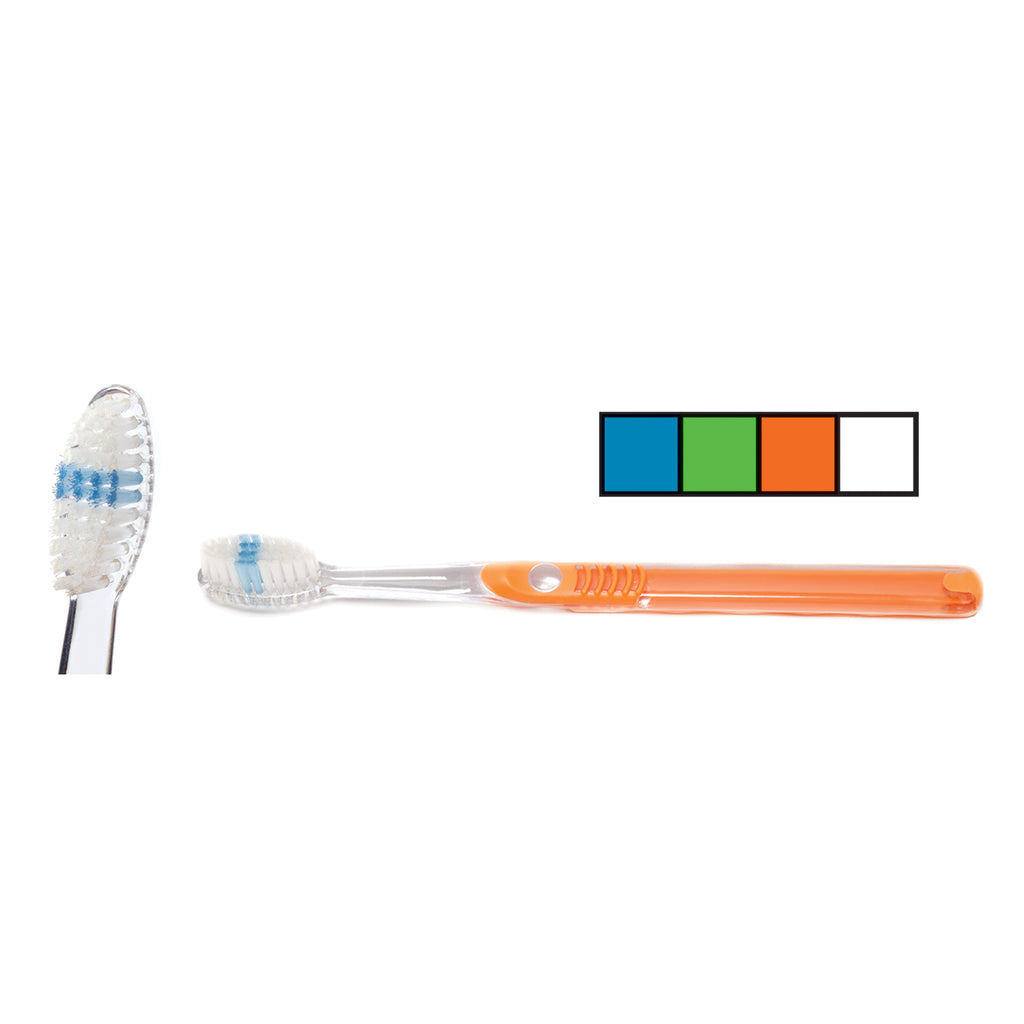 38 Tuft Two-Tone Soft, End Rounded Bristles, With Two Rows Of Blue Bristles That Fade With Use To Indicate Replacement. Classic Flat Trim. Clear, Highly Polished Cosmetic Quality Straight Handle With Rubber Thumb Grips. Clear Brush With Four Accent Colors (Blue, Green, Orange, White).