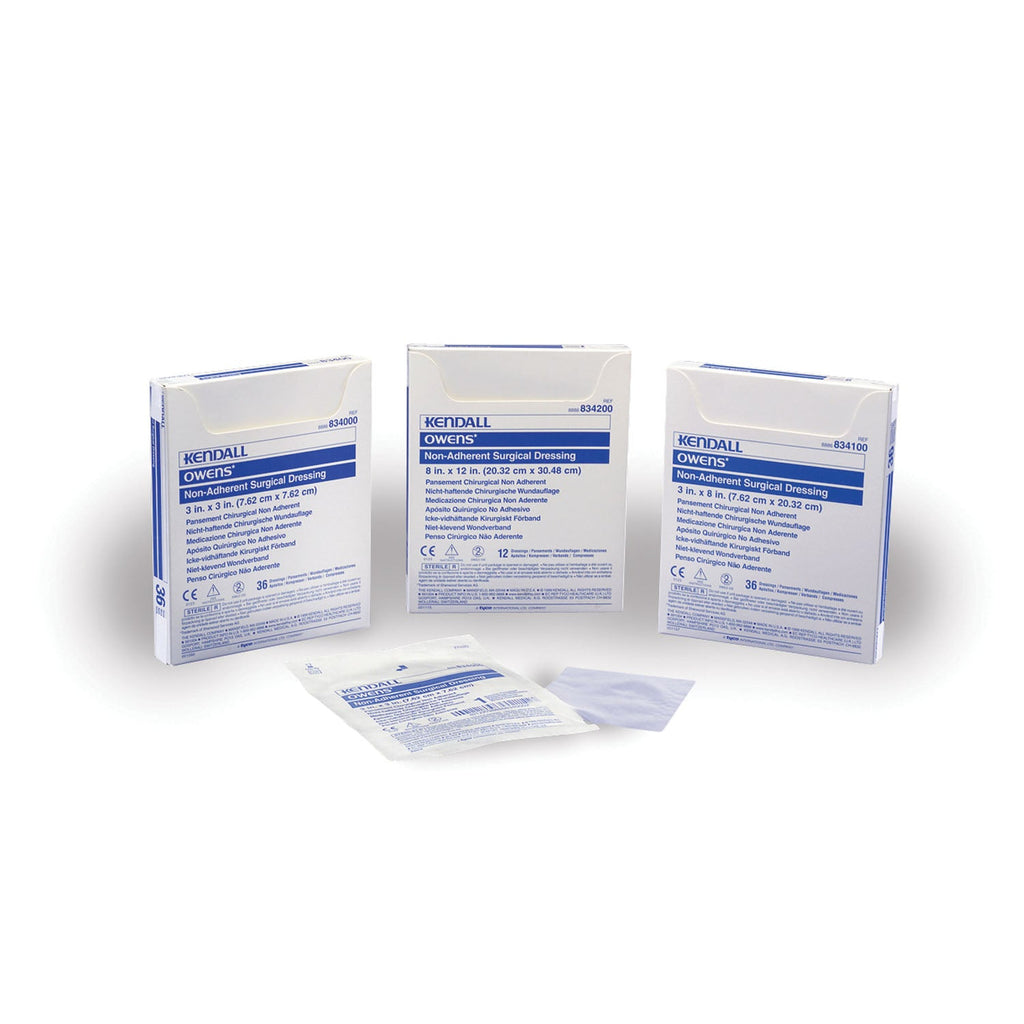 CARDINAL HEALTH OWENS NON-ADHERENT SURGICAL DRESSING For burns, incisions, granulating areas, skin grafts and lacerations. Sterile. DRESSING SURGICAL NON ADHERENT3X3 ST 36/CT SKU: 8886834000 Manufacturer: Cardinal Health NDC-10250225_ct