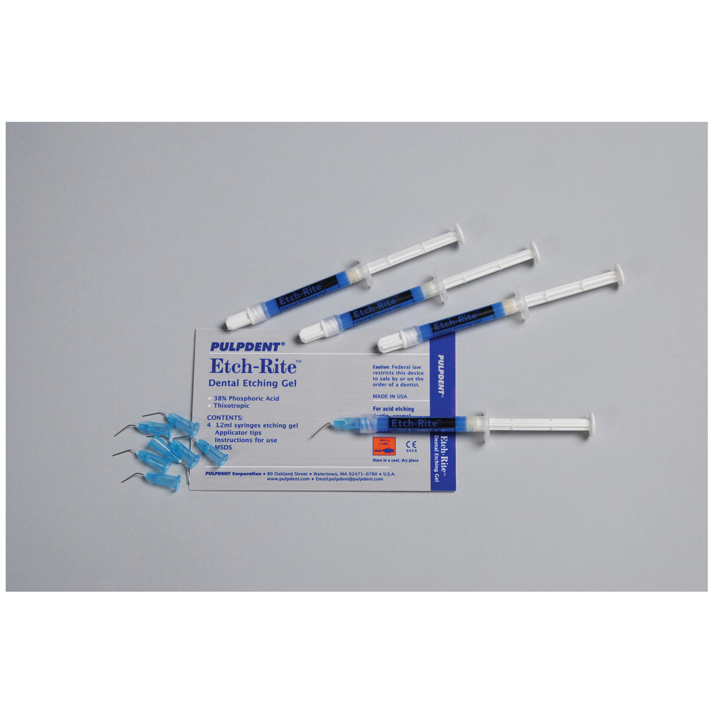 Etch-Rite™ 38% Phosphoric Acid Is A Soft, Thixotropic Gel With Handling Characteristics Most Preferred By Clinicians. It Dispenses Through Small Gauge Needles, Stays Where Placed, Washes Off With Ease, And Provides The Optimal Etch Pattern On Dentin And Enamel Surfaces To Ensure Mechanical Retention Of Bonding Agents, Restorative Resins And Resin Cements. The Blue Gel Is Easily Visible And The Material Is Available In A Wide Variety Of Packaging Options.