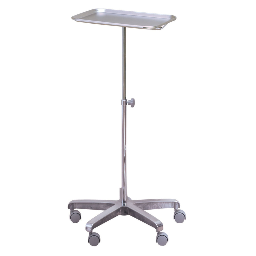 Screw lock adjustment provides secure lock at desired height. Large stainless steel instrument tray is removable for easy cleaning.
