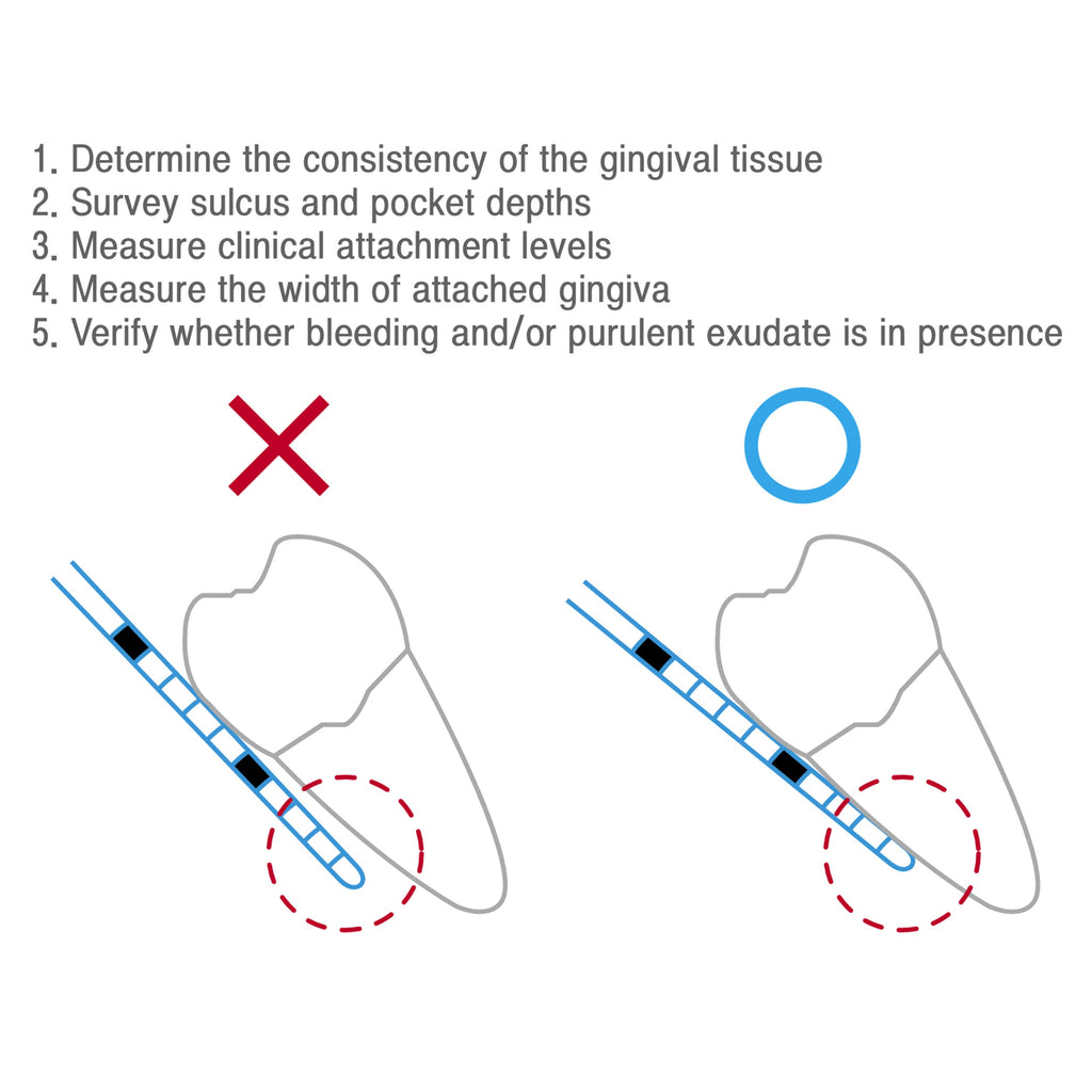 Probe measures the depth of periodontal pocket, height of attachment, anatomical shape and bleeding of gingiva.